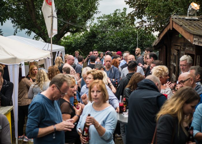 Es gibt Essen vom Grill (auch vegan!) sowie Bier und anti-alkoholische Getränke.